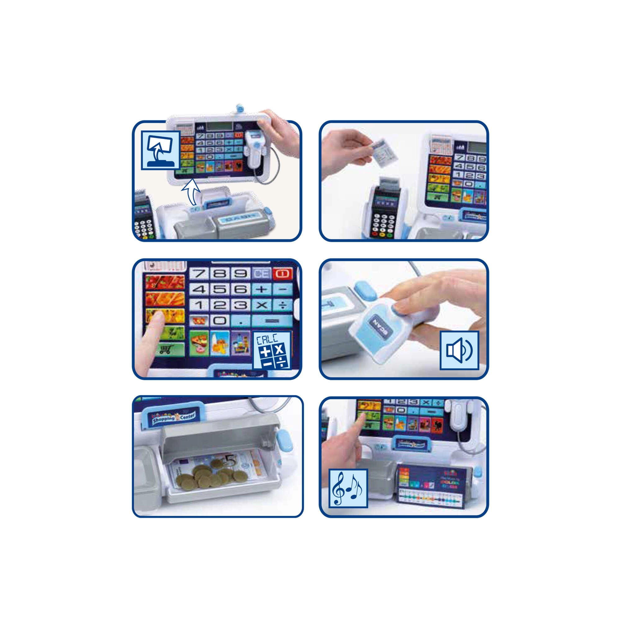 • Fonctions réalistes : écran avec calculatrice, scanner, lecteur de cartes, sons de caisse.