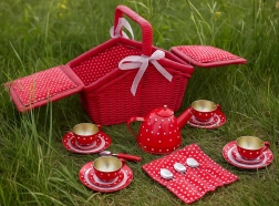 Ce charmant panier de pique-nique aux motifs à pois et petits cœurs renferme un service à thé en métal prêt pour chaque goûter imaginaire. La conception robuste avec sangles velcro réglables et bord textile garantit un transport et un rangement faciles de toutes les pièces. Les enfants développent leur interaction sociale, leur motricité et leur créativité.
