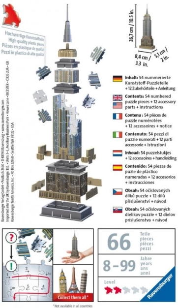 Découvrez le charme de l’emblématique monument new-yorkais au format compact. Le mini puzzle 3D Empire State Building restitue fidèlement les détails architecturaux et, grâce à ses pièces en plastique dimensionnellement stables, tient parfaitement sans colle. L’assemblage est intuitif – suivez le motif ou la numérotation des pièces pratique.