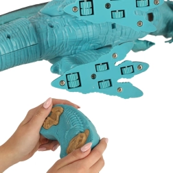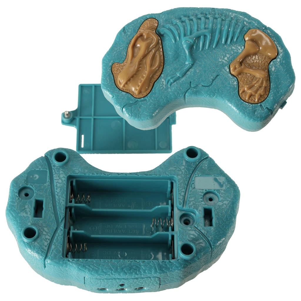 La télécommande ressemblant à un fossile avec deux boutons facilite la commande des mouvements et des sons du dinosaure.