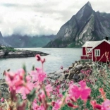 - Paysage scandinave – Lofoten, Norvège (chalet au bord du lac, montagnes, fleurs)