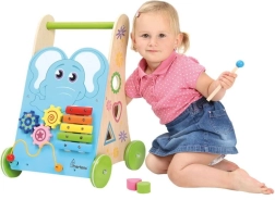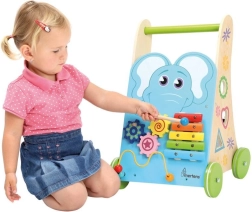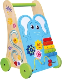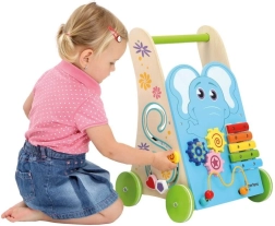 Soutenez les premiers pas et l’esprit curieux de votre enfant avec ce chariot de marche en bois de qualité, décoré d’un éléphant. Il offre un xylophone au son doux, un labyrinthe de perles, un jeu d’encastrement et des roues dentées pour s’amuser tout en développant la motricité. Des roues en caoutchouc silencieuses protègent le sol et la structure stable en bois FSC garantit un jeu sécurisé à partir de 18 mois.