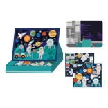 Le théâtre magnétique de l’espace propose d’infinies combinaisons et scènes sur deux fonds magnétiques – dans l’espace et dans la station spatiale. Grâce à plus de 50 pièces magnétiques, les petits explorateurs peuvent créer des histoires originales, développer leur imagination et leur motricité fine. La boîte pratique avec support et butées permet d’installer facilement la scène partout.