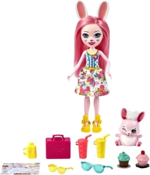La poupée Bree avec ses longs cheveux roses et ses oreilles de lapin est prête à partir. Sa tenue comprend une robe d'été à imprimé floral, des chaussures et des lunettes de soleil.