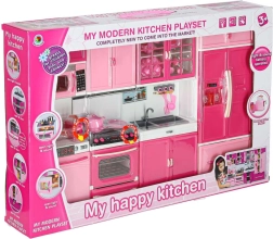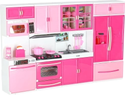 Le set comprend un micro-ondes et un lave‑vaisselle, une cuisinière avec four, une vitrine avec évier et un réfrigérateur avec tiroir. Les enfants profiteront d’un scénario complet de cuisson, de pâtisserie et de rangement.