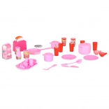 Le coffret comprend de nombreux accessoires : casseroles avec couvercles, poêle, grille‑pain avec levier mobile, vaisselle, tasses, gobelets, « boîte de lait », ustensiles de cuisine sur crochets et « glaçons ». Les placards à portes ouvrantes, le tiroir coulissant et les étagères apprennent l’ordre aux enfants, développent la motricité fine et les compétences sociales.