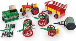 Le set comprend un petit tracteur Zetor avec des jantes en plastique et un mécanisme à remontoir manuel, qui se tend avec une clé. Il offre trois vitesses différentes vers l'avant, une vitesse en marche arrière, une position neutre et un frein manuel. Les accessoires incluent: