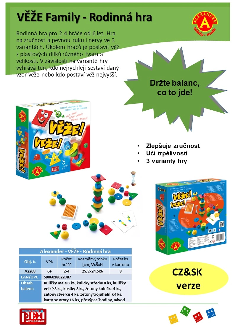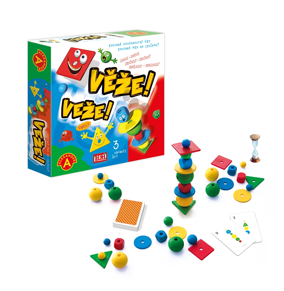 Jeu familial amusant pour 2 à 4 joueurs dès 6 ans, où vous testez votre patience, votre précision et votre dextérité. Construisez des tours avec des pièces de formes variées dans trois modes compétitifs et profitez à la fois de la tension et des rires. Gardez l’équilibre au maximum – gagne celui qui reproduit le modèle le plus vite ou qui érige la tour stable la plus haute.