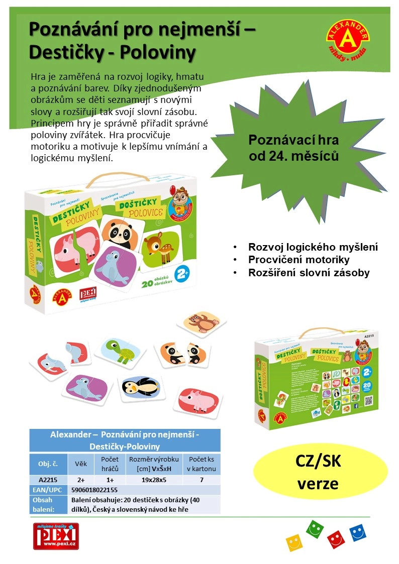 Ce jeu simple et malin d’ALEXANDER est conçu pour les plus jeunes explorateurs. Les enfants associent les bonnes moitiés d’animaux et entraînent ainsi leur logique, le toucher et la perception des couleurs. Grâce aux images simplifiées, ils découvrent de nouveaux mots et développent leur vocabulaire en douceur.
