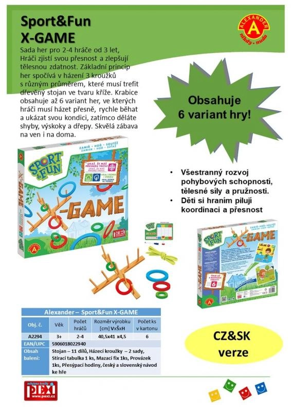 SPORT & FUN d’ALEXANDER a été récompensé Jouet de l’année 2020 en République tchèque dans la catégorie OUTDOOR. X-GAME est un ensemble dynamique dans lequel vous lancez 3 anneaux de différents diamètres sur un support en bois en forme de croix. Vous gagnez des points selon la taille de l’anneau et la zone touchée. Le jeu favorise la coordination, l’équilibre et développe de saines habitudes par le mouvement.