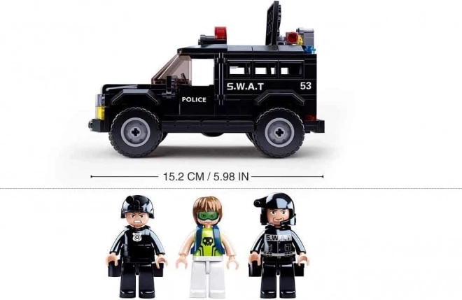 Véhicule de police noir avec toit pour figurine, marquages S.W.A.T. et éléments réalistes comme des feux, des rétroviseurs et des roues robustes.