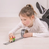 Transformez le salon, la chambre d’enfant ou même une valise de voyage en monde ferroviaire. Le ruban adhésif à motif de rails permet aux enfants de créer immédiatement une voie sur laquelle le petit train en bois inclus peut circuler. Un excellent jeu créatif pour les passionnés de trains, qui stimule l’imagination et la motricité fine.