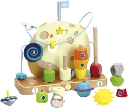Ce jouet en bois étoilé de Vilac emmène les enfants dans un univers intergalactique, où ils peuvent empiler les planètes, compter et faire glisser les étoiles le long d’un fil. Des éléments ingénieux favorisent le développement de la motricité fine, la pensée logique et la perception des couleurs.