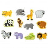 - 12 figurines en bois d’animaux exotiques + valisette (au total 13 pièces)
