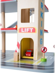 Grâce à sa construction en bois durable, le jouet est résistant et durable. Les dimensions du parking sont de 35x48x38 cm et conviennent aux enfants à partir de 3 ans.