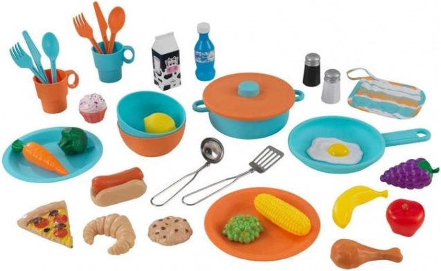 Le coffret comprend 38 pièces de vaisselle, aliments et ustensiles de cuisine. Les enfants peuvent immédiatement servir, mélanger, couper et découvrir de nouvelles recettes.