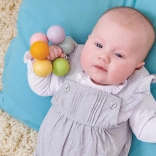 Des billes en bois pastel sur un élastique se tiennent agréablement en main et aident à soulager les gencives sensibles lors des poussées dentaires.