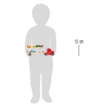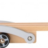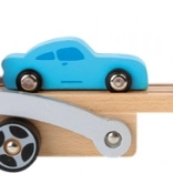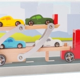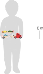 Offrez aux enfants un jeu réaliste avec ce transporteur de voitures en bois, capable d’emmener quatre petites voitures de sport colorées. Attachez la remorque au tracteur, abaissez la plateforme supérieure et faites monter ou descendre les voitures par la rampe en toute simplicité. La barrière sur la plateforme relevée empêche tout recul involontaire – tout est prêt pour de longs trajets en toute sécurité.