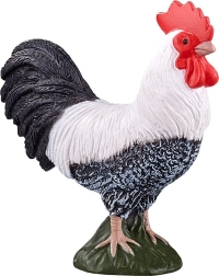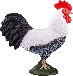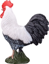 Plumage fidèlement sculpté, contraste noir et blanc et crête rouge pour un aspect authentique du coq.