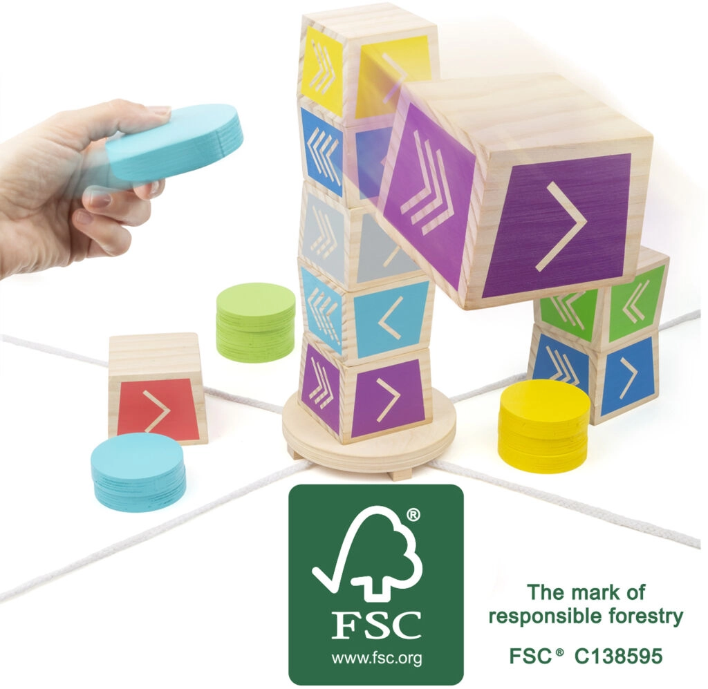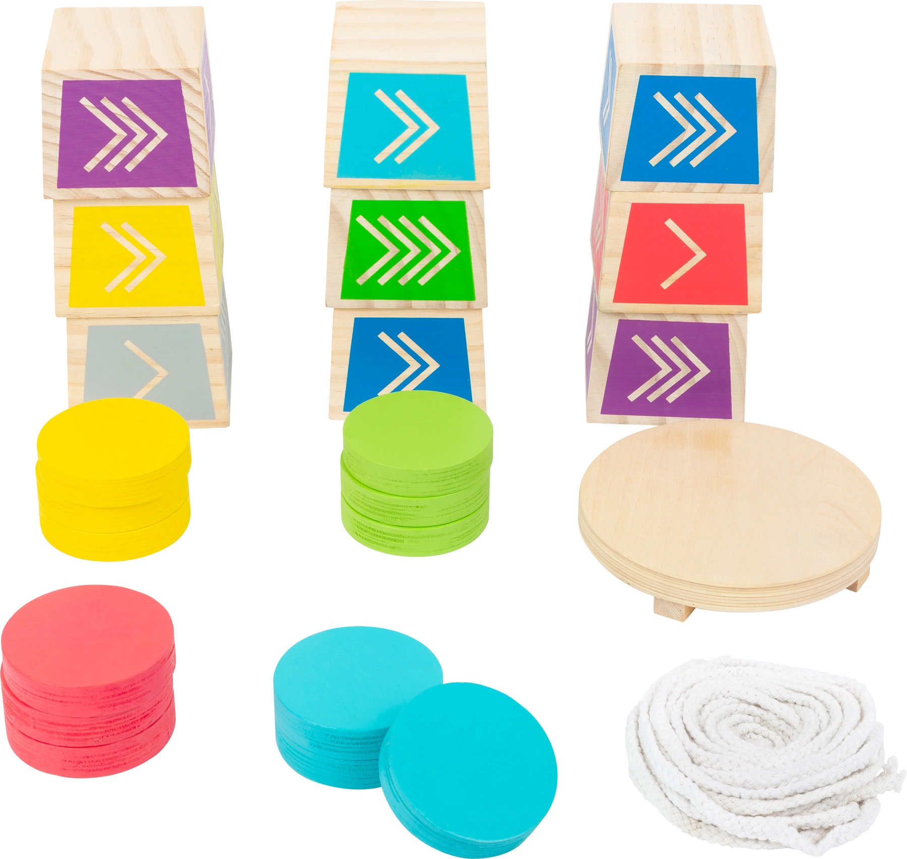 Profitez d’une animation dynamique en famille ou entre amis. Ce jeu d’adresse en bois, dans l’esprit du Kubb, séduit par ses règles simples et son déroulement palpitant – l’objectif est de ne faire tomber que le cube du dessus de la tour avec des disques colorés. Grâce à sa fabrication de qualité en bois 100 % FSC, le jeu est durable, sûr et respectueux de la nature.
