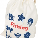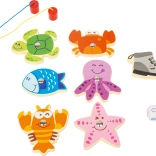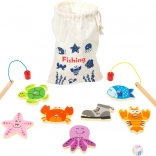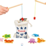 Pendant le jeu, les enfants attrapent différentes créatures marines colorées à l’aide de deux cannes magnétiques. Le jeu est accompagné d’un dé coloré qui indique quel animal doit être pêché. Le tout est rangé dans une pratique pochette en tissu, idéale pour voyager.