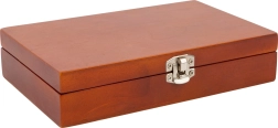 La solide boîte en bois avec loquet métallique protège les cartes et les dés. Se glisse facilement dans un sac à dos ou une valise.