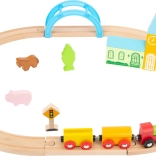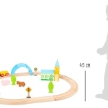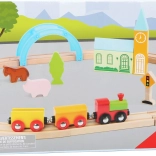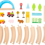 Le set comprend 24 pièces, dont un train magnétique avec wagons, des rails encliquetables en bois et des éléments décoratifs colorés. La fabrication robuste en bois est agréable au toucher, sûre et idéale pour les petites mains. Le jeu développe naturellement la motricité fine, la coordination œil–main et l’apprentissage des règles de circulation.