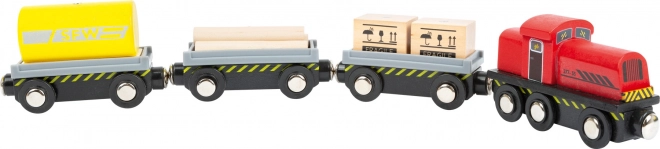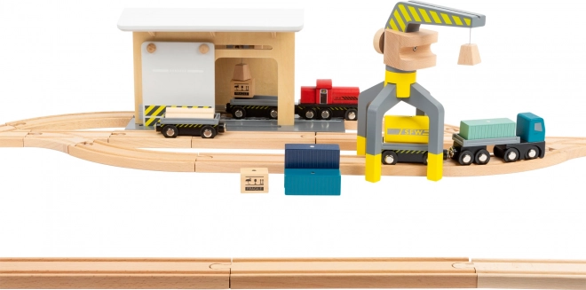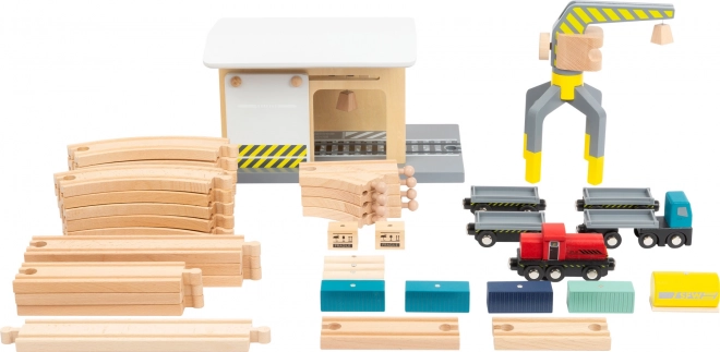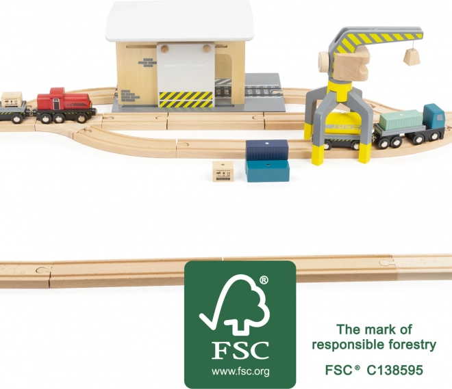 Découvrez un ensemble complet en bois pour petite voie ferrée, entièrement compatible avec les circuits de trains en bois courants. Les enfants apprécieront le chargement réaliste avec la grue, le transport de marchandises et le jeu au dépôt. Le set comprend jusqu’à 44 pièces, dont 25 rails, une grue rotative à 360°, des wagons et cargaisons magnétiques et une paroi coulissante avec poulie. Fabriqué en bois 100 % FSC pour un jeu sûr et durable.