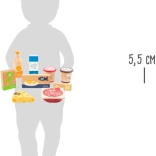 L’ensemble comprend du jus d’orange, deux pots de glace, un paquet de petits pois, des bâtonnets de poisson, du beurre, du fromage, du saucisson tranché et une brique de lait. Les impressions réalistes et l’apparence naturelle séduisent au premier regard. Grâce au bois robuste, l’ensemble est durable et prêt pour un usage quotidien.