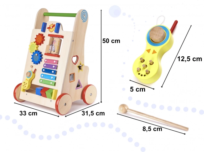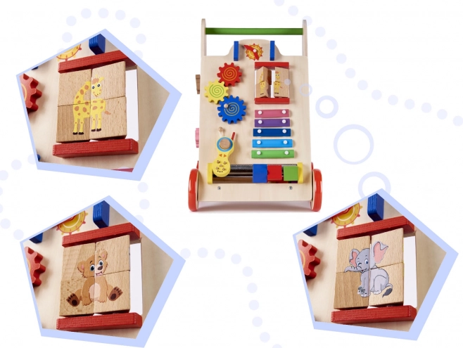 Toutes les pièces du chariot sont soigneusement poncées pour protéger les petites mains des échardes, et peintes avec des peintures non toxiques et écologiques. La structure est stable, avec des roues en bois gainées de caoutchouc pour plus de sécurité. Le chariot possède également sur les côtés un tri de formes avec quatre blocs colorés et un labyrinthe avec de jolis animaux.