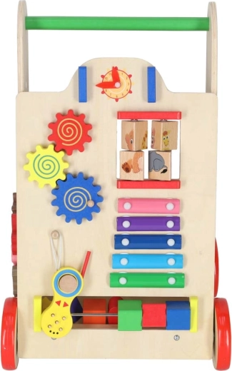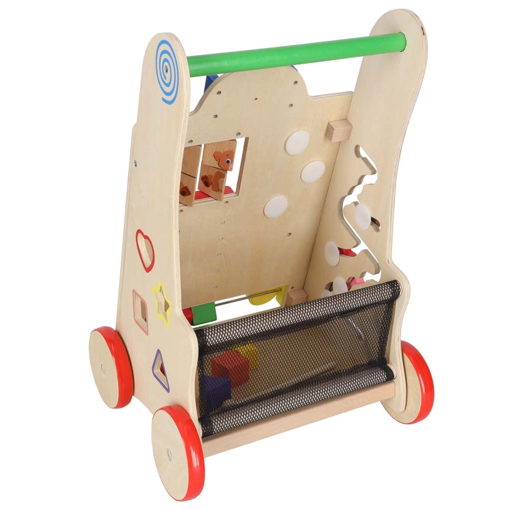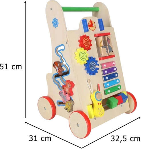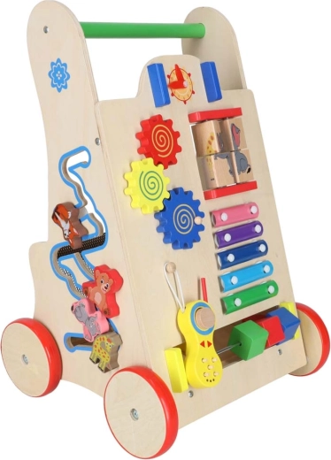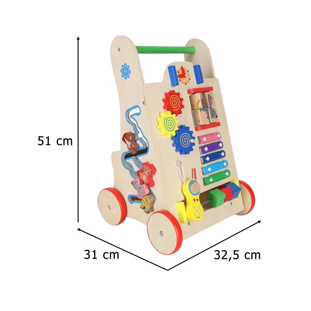 Découvrez le chariot marcheur multifonction en bois 6-en-1, qui combine soutien à la marche et centre éducatif en un seul produit. Le panneau avant propose des activités variées : aiguilles d’horloge mobiles, engrenages rotatifs, petit xylophone avec baguette, éléments coulissants et images rotatives. Les côtés sont complétés par un trieur de formes et un labyrinthe amusant avec des animaux. Grâce à sa structure stable et à ses roues avec caoutchouc antidérapant, la marche est plus sûre et plus assurée.