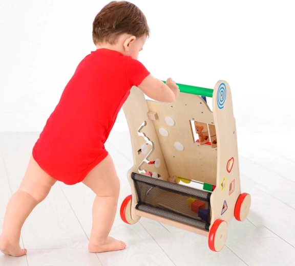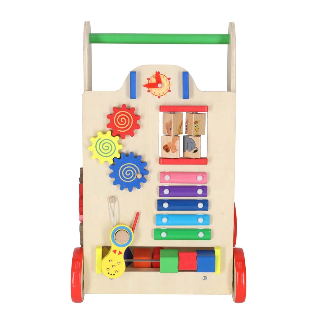 Le chariot marcheur en bois 6-en-1 aide les enfants à s’entraîner à faire leurs premiers pas en toute sécurité, tout en offrant de nombreuses activités pour la motricité fine, la perception sensorielle et l’apprentissage. Sa construction stable avec roues en caoutchouc assure une marche sûre, tandis que le xylophone, les engrenages, l’horloge et le trieur de formes divertissent pendant de longues heures. La pratique boîte de rangement avec filet accueille la baguette et d’autres jouets.