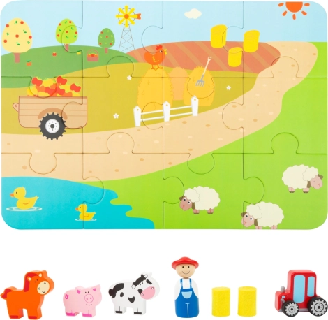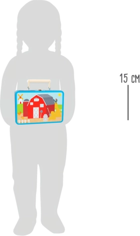 Le petit cochon grogne, le tracteur bourdonne. Un jeu portable dans une jolie petite valise : les enfants peuvent créer leur propre ferme grâce aux figurines en bois en forme de tracteur, d’animaux domestiques et d’agriculteur. D’abord, assemblez la base avec le puzzle, puis vous pouvez commencer à jouer ! Les bottes de foin figurines complètent la ferme à la perfection. Plongez dans la vie à la campagne et laissez libre cours à votre imagination. La valise est fabriquée en métal robuste, la poignée est en bois et la serrure s’ouvre facilement. Idéal pour les chambres d’enfants, les salles de jeux... Principales caractéristiques : comprend 12 pièces de puzzle et un fermier, un tracteur, un petit cochon, une vache, un cheval et des bottes de foin; emballage pratique – valise métallique avec poignée en bois