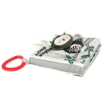 Le livre est léger, compact et, grâce à l’anneau de suspension, se fixe facilement à la poussette, au siège auto ou au lit bébé. Le froissement, le grelot et le sifflet éveillent la curiosité, incitent à saisir, appuyer et feuilleter — des activités qui soutiennent le développement sensoriel et le jeu autonome, y compris en déplacement.
