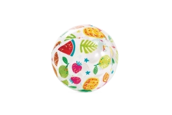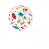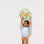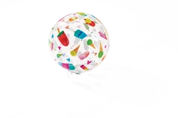 Le ballon transparent est décoré d’imprimés colorés de fruits, glaces, poissons et thèmes marins. Le motif est choisi aléatoirement, mais garantit toujours un look joyeux et une bonne visibilité dans l’eau comme sur la plage.