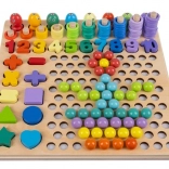 Ce coffret éducatif en bois complet combine mosaïque avec perles, assemblage de formes et pêche magnétique. Les enfants s’exercent de manière ludique aux nombres, au tri des couleurs et à la reconnaissance des formes, tout en développant la motricité fine et la préhension grâce à la pince, aux baguettes et à la cuillère. Convient au jeu autonome comme à l’apprentissage partagé avec les parents.