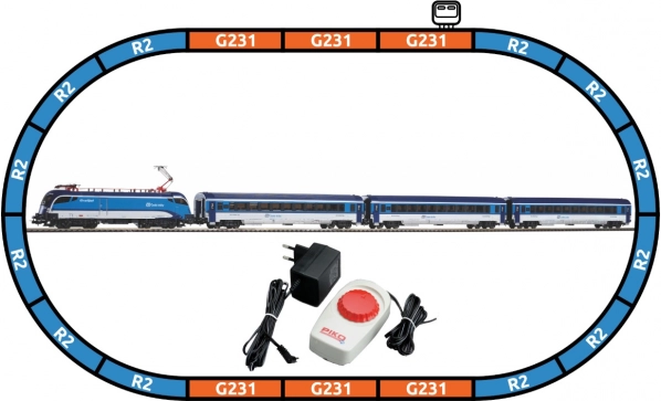 La rame dispose de feux blancs à commutation automatique selon le sens de marche, d’attelages conformes NEM 362 et de quatre essieux pour un contact fiable avec les rails. L’ovale de base occupe 158 × 88 cm ; pour un montage confortable, une surface minimale de 168 × 98 cm est recommandée.