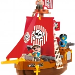 Le bateau est équipé d’éléments détaillés comme des voiles rouges avec un motif de tête de mort et d’os croisés, offrant aux enfants une expérience pirate authentique.