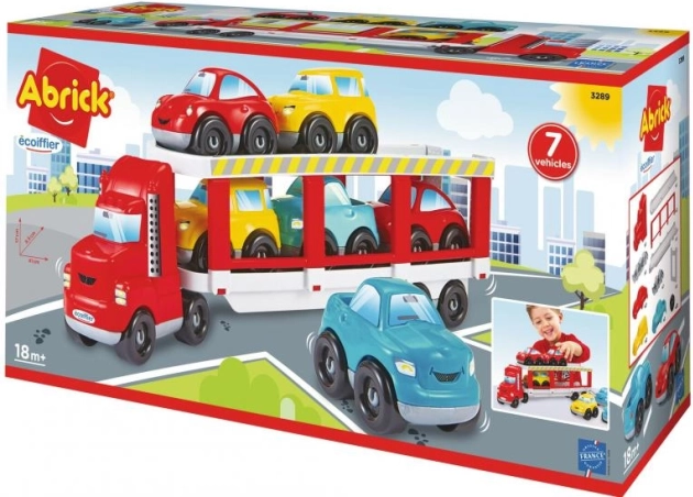 Attractif transporteur Abrick pour le transport de petites voitures ! Le transporteur est équipé d'une rampe rabattable qui permet un chargement et un déchargement faciles de six petites voitures colorées.