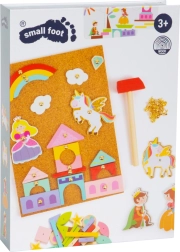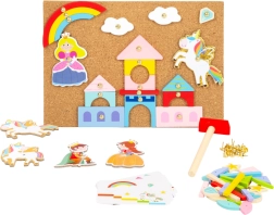 Jeu à marteler Licorne est un jouet magique qui développe la créativité et la motricité fine de vos enfants. L’ensemble comprend une plaque en liège, un marteau, des punaises et des éléments en bois de différentes formes comme une princesse et une licorne.