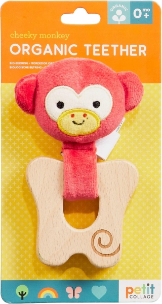 Adorable anneau de dentition Petit Collage en forme de singe, combinant coton biologique doux et bois de hêtre FSC robuste pour un mâchouillage sûr et apaisant. Grâce à sa prise en main facile pour les petites mains, il est idéal dès la naissance et aide lors de l’apparition des premières dents. Conçu dans le respect de la nature – sans emballage plastique et avec un rembourrage en matériaux recyclés.