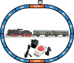 - Locomotive à vapeur BR 98 avec tender (1 pc), voiture voyageurs 2e classe DB III (2 pcs), voies : courbes R2 avec ballast 55412 (12 pcs), droites G231 55401 (1 pc), droite G231 avec connexion 55406 (1 pc), socle pour borne d’alimentation 55447 (1 pc), borne d’alimentation 55270 (1 pc), contrôleur analogique avec alimentation 55003 (1 pc)