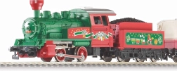 Locomotive à vapeur 0-4-0 avec tender, voiture voyageurs et deux wagons de fret dans un design festif harmonisé. Parfait pour créer instantanément l’atmosphère.