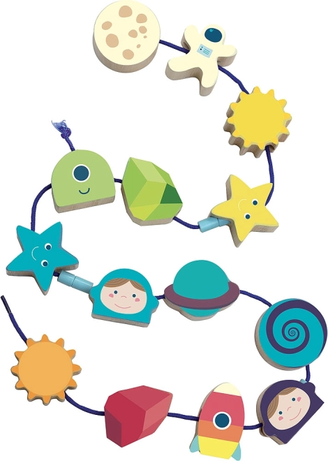 Magnifique jeu de l'espace à enfiler, idéal pour le développement de la motricité fine chez les enfants. Contient 14 perles en bois magnifiquement illustrées telles qu'astronaute, lune, soleil et fusée.