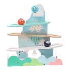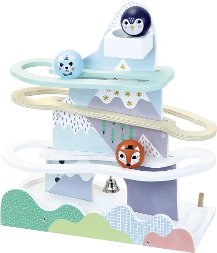 Belle piste de billes en bois avec des motifs de la faune et de la flore nordiques illustrés par Michelle Carlslund. Un produit écologique qui développe la motricité et la concentration des enfants. Soyez le premier à faire tinter la cloche et voyez si le pingouin, l’ours ou le renard arrive le premier à l’arrivée !