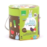 Le set de 14 perles illustrées (p. ex. aubergine, tomate, petit oiseau, bottes) stimule l’imagination, l’apprentissage des couleurs et l’enrichissement du vocabulaire.