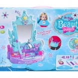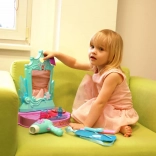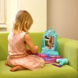 Cet élégant ensemble de coiffeuse, aux couleurs turquoise et violet, offre des heures de jeu créatif. L’élément central est un miroir avec effets lumineux et sonores – une fois activé, il lance des mélodies qui intensifient l’ambiance des jeux de salon de coiffure ou de beauté.