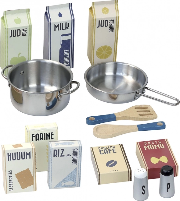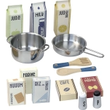 Grâce à sa structure en bois robuste, la cuisine est stable et durable. Elle comprend une toque et un tablier de chef, une salière et une poivrière, une spatule, une casserole, une poêle et des aliments en briques carton type tetrapak – tout est prêt pour cuisiner en s’amusant. Un assemblage simple est nécessaire après déballage.