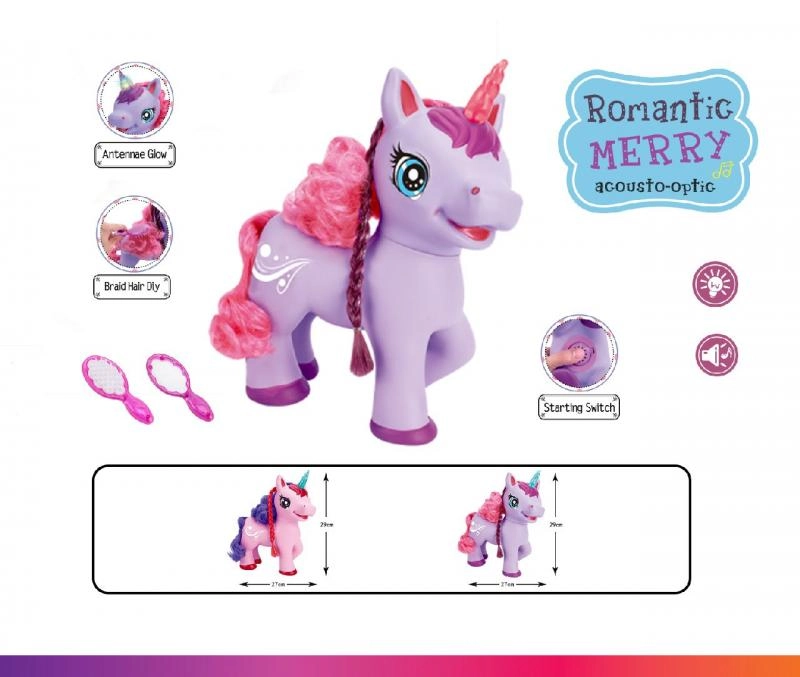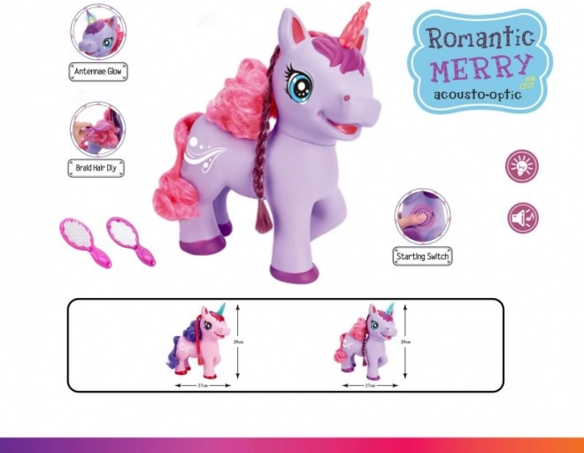 Adorable licorne violette à piles qui ravira les enfants grâce à ses effets – en appuyant sur le bouton sur son ventre, elle commence à chanter une chanson en anglais, émet des sons magiques et sa corne s’illumine. Sont inclus un peigne et un miroir pour coiffer sa longue crinière.