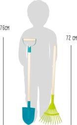 La pelle mesure 76 cm, le râteau 72 cm. La taille est adaptée aux mains des enfants pour un travail au jardin sûr et agréable.